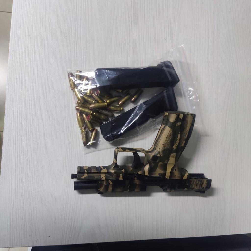 Na sequência, os policiais realizaram a abordagem e a busca pessoal, localizando na cintura do suspeito uma pistola calibre 9 mm, municiada, com 15 munições no carregador e uma munição na câmara. Durante a revista, também foi encontrado um segundo carregador, com mais 11 munições, no bolso do short.
