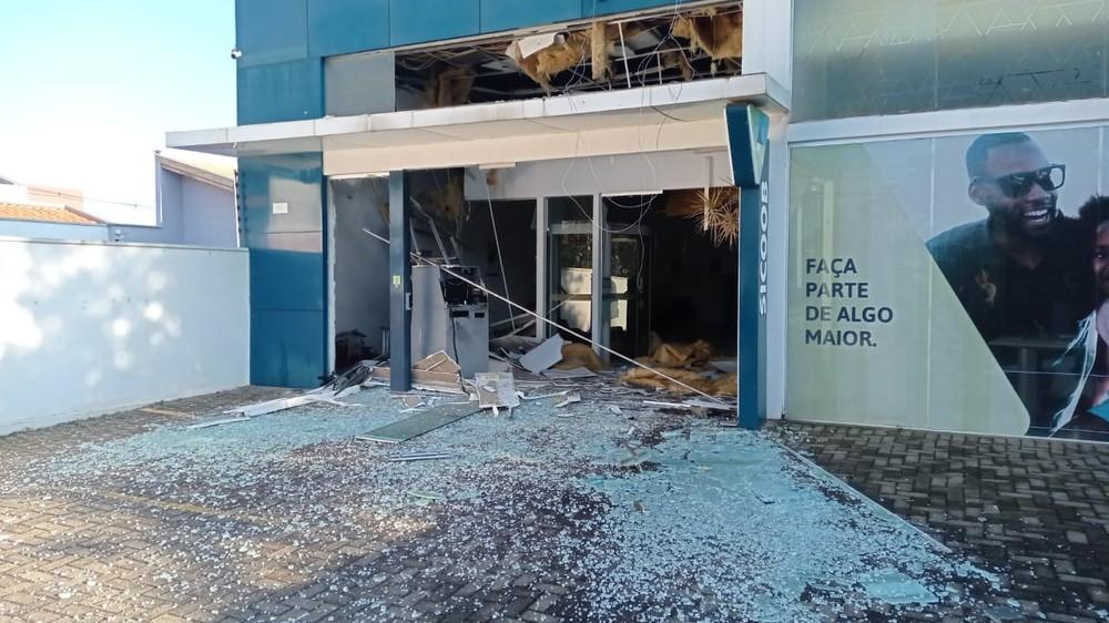 "As imagens mostram dois homens estacionando um veículo perto do estabelecimento. Um deles desce, quebra a porta de vidro com um pé de cabra e coloca um artefato explosivo no caixa eletrônico. Após a explosão, ele volta para ver o resultado e, vai embora com o outro suspeito"