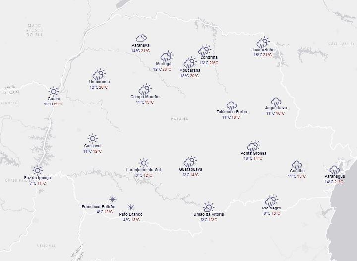 Durante esta quinta-feira (04) o destaque é o declínio das temperaturas para todas as regiões do Paraná. Ainda chove entre cidades do norte e leste do Estado, mas não por muito tempo.