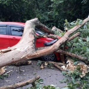 Uma árvore caiu e atingiu um carro e um caminhão na manhã desta quinta-feira (3) na SC-150, em Lacerdópolis, no Meio-Oeste. Um Fiat Cronos, placas de Capinzal, foi atingido no para-brisa e capô. Também ficou danificado um Ford Cargo, placas Fraiburgo que se deslocava em direção a Ouro.