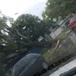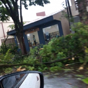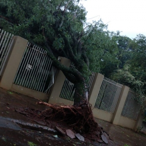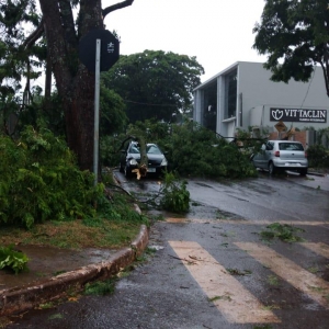 A estação do Simepar registrou rajada de vento de até 70 km/h em Cascavel e diversas árvores caíram na cidade. Não há registro de feridos.