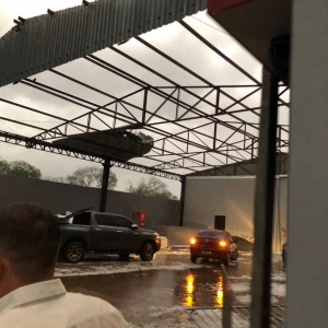Um veículo novo de uma revendedora de Palotina ficou embaixo da estrutura metálica que caiu com o temporal, danificando o carro que seria exposto a partir da noite de hoje.