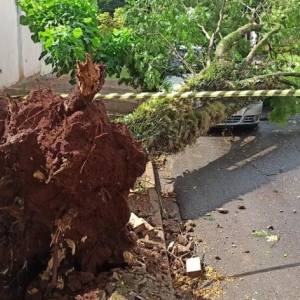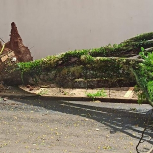 Árvores caíram com a força dos ventos, na área central e também na região do lago municipal.