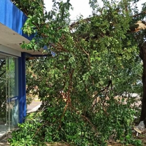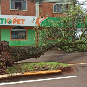 Na avenida Maripá uma árvore de grande porte caiu interditando uma das pistas, a fachada de um comércio de petshop foi atingida por galhos de árvores e teve prejuízos.