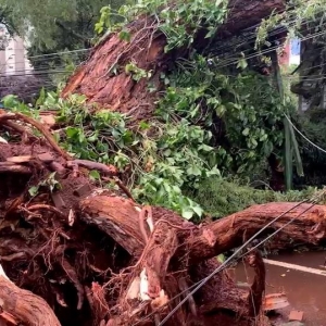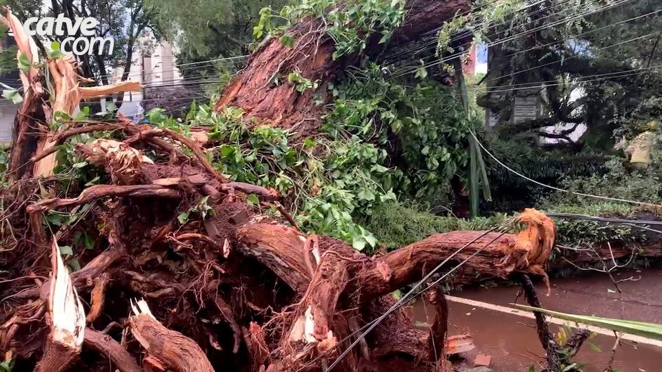 A chuva rápida acompanhada de ventos fortes, causou estragos no Centro de Cascavel na tarde desta quarta-feira (29).
