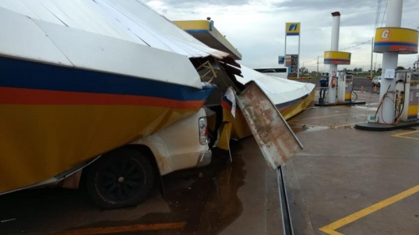 O teto de um posto de combustíveis caiu sobre três veículos e sobre um restaurante, na tarde desta terça-feira (23), na BR-376, em Marialva, no norte do Paraná. Uma mulher e o filho de sete anos estavam dentro de um dos carros, mas ninguém ficou ferido.