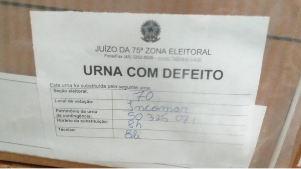Toledo teve duas urnas substituídas com problemas técnicos, nesta manhã de domingo (30). Os locais foram no Incomar e Boa Vista.