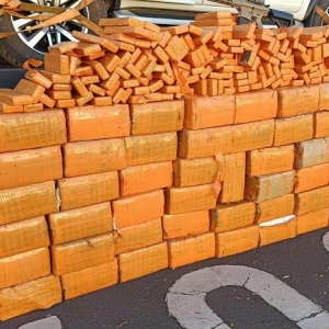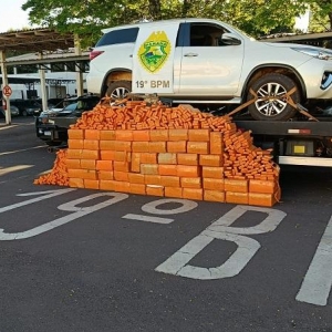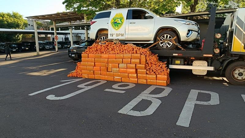 Em vistoria ao veículo, os policiais encontraram a carga de maconha dividida em fardos e o fuzil envolto em papel e plástico, além de uma mira holográfica lacrada. Após consulta no sistema, foi confirmado que a caminhonete havia sido furtada em Cascavel, em julho de 2024, e circulava com placas clonadas.