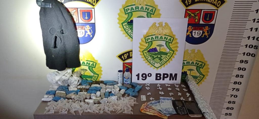 Os policiais então encontraram e apreenderam com o palotinense, 100 pedras de crack, 53 invólucros de maconha (500 gramas), 112 pinos vazios (que são usados para armazenar cocaína), 1 rolo de papel alumínio e uma lâmina de aço (usada para fracionar a substância entorpecente) e R$ 46,00 em espécie.