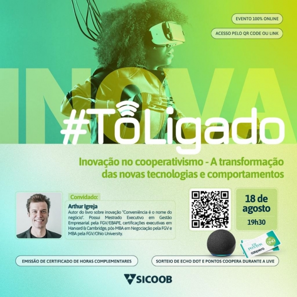 No próximo dia 18 de agosto, às 19h30, a cooperativa irá promover o #TôLigado, um bate-papo que contará com a participação do escritor e palestrante, Arthur Igreja, para falar sobre “Inovação no cooperativismo – a transformação das novas tecnologias e comportamentos”.