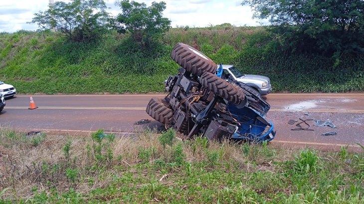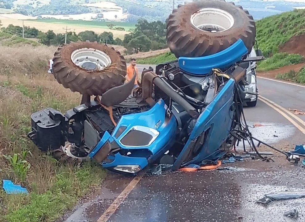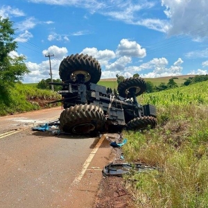 Um trator recém-comprado, que estava sendo transportado ao comprador em um caminhão, caiu da prancha na PR-566, trecho que liga o Distrito de Vista Alegre, em Coronel Vivida, a Itapejara D’Oeste – municípios do sudoeste do Estado.