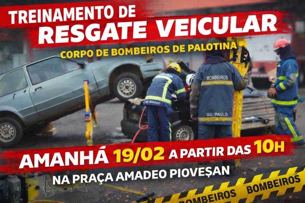 O Corpo de Bombeiros de Palotina promove na manhã de quinta-feira (19) um treinamento de resgate veicular na Praça Amadeo Piovesan. A atividade está prevista para começar a partir das 10h e deve mobilizar equipes da corporação em uma simulação prática de atendimento a vítimas presas em ferragens.