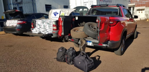 No veículo Fiat Strada foram encontrados caixas de cigarros contrabandeados e um rádio comunicador, no Renault Fluence 1.250 pacotes de cigarros contrabandeados e um rádio comunicador e na Fiat/Toro foi localizado um rádio comunicador e peças dos veículos Fluence e Strada, caracterizando a prática de associação criminosa.