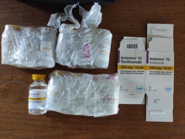 Segundo a Polícia Rodoviária Federal (PRF), o trio estava em um carro com placas de Itapevi, no interior de São Paulo, e transportava em uma bolsa térmica o remédio chamado de Actemra IV - Tocilizumab. Foram encontradas oito ampolas de 200 mg/10ml e duas ampolas de 400 mg/20 ml.