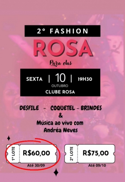 Encerra-se hoje (30) o prazo para a compra dos ingressos do 1º lote do 2º Fashion Rosa – Para elas, que acontece no dia 10 de outubro, às 19h30, no Clube Rosa.