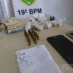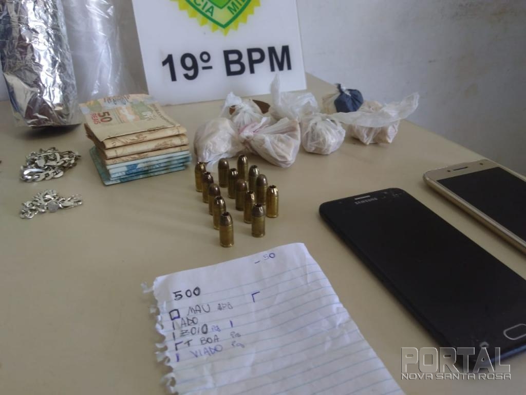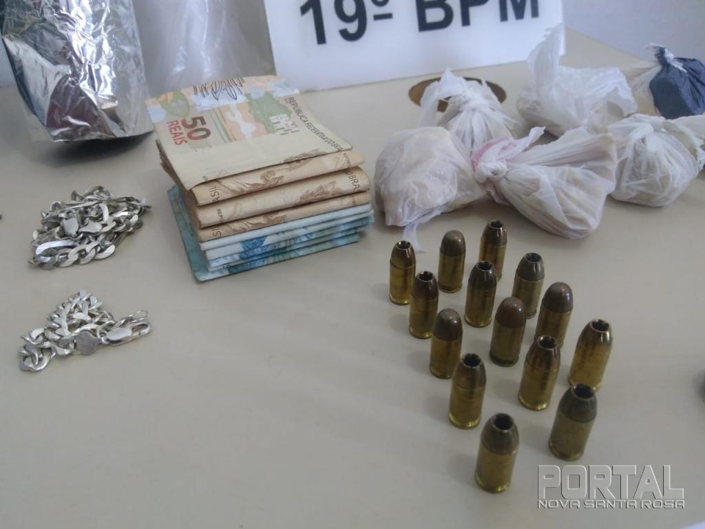Os policiais, acompanhados do casal foram até a casa localizada na rua General Câmara e foi encontrado seis porções em sacolas plásticas que totalizaram a quantia de 25 gramas cada porção, havendo 150 gramas ao total na residência, também foi encontrado três anotações contabilizando a venda da droga além da quantia de R$ 2.350,00, ainda em buscas foram localizados no interior de uma meia 14 (quatorze) munições intactas de cal. 380 da marca CBC.