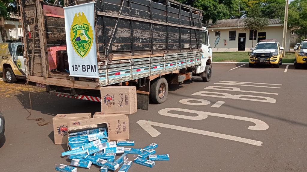 Na sequência os policiais localizaram o caminhão com a carga de cigarros com aproximadamente 250 caixas de cigarros da marca Classic contrabandeados do país vizinho.