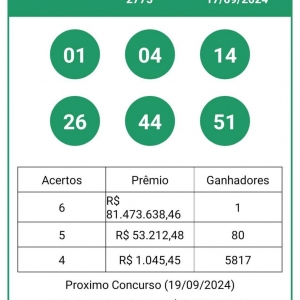 O concurso da Mega-Sena realizou ontem (17) mais um sorteio. Os números sorteados na edição 2775 foram: 01-04-14-26-44-51.