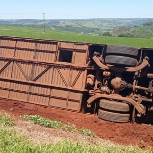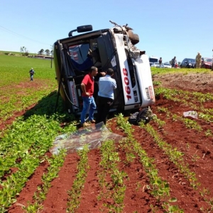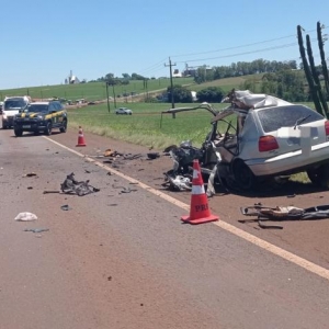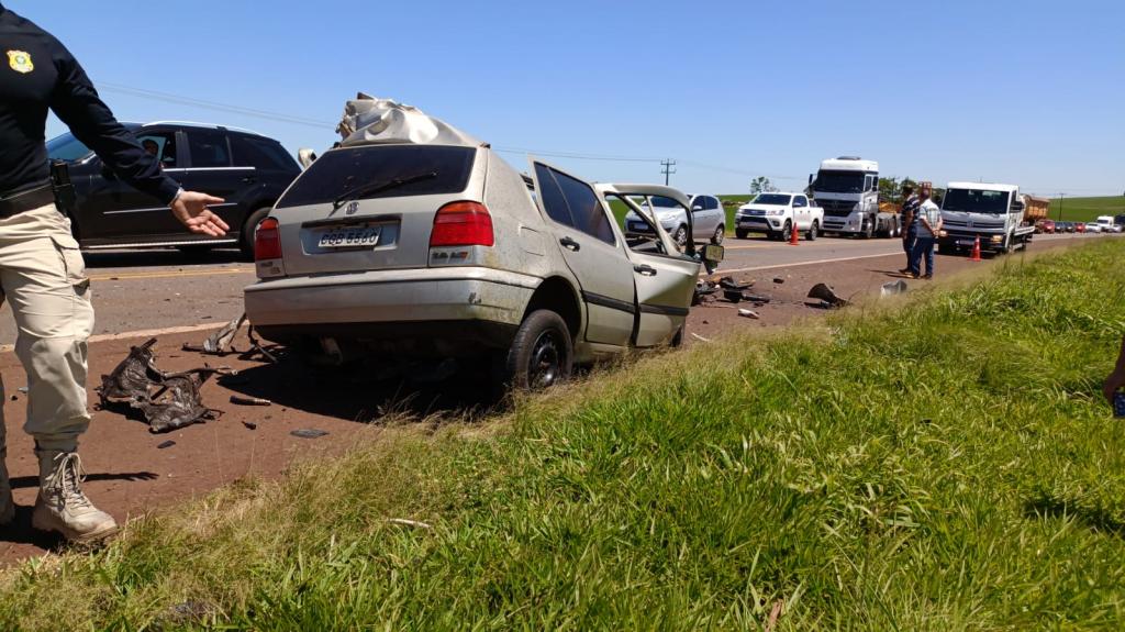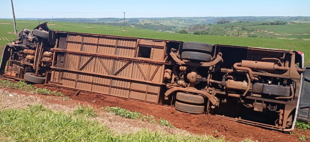 Com o impacto da batida, o carro ficou completamente destruído. Já o ônibus saiu da pista e tombou em uma lavoura às margens da rodovia.