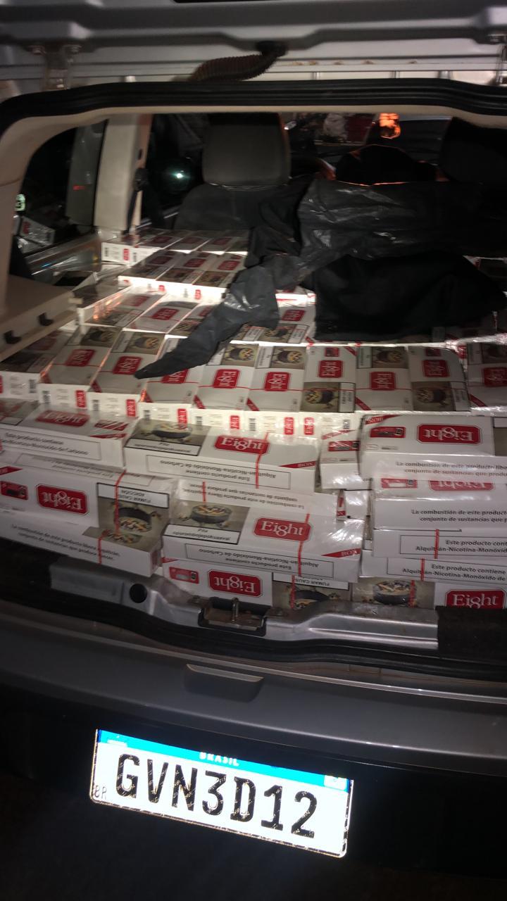 Foi dado ordem de parada a este último veículo com o uso de giro e sirene, o mesmo veio a adentrar em uma estrada rural sem saída, abandonando o veículo ainda ligado em meio a lavoura. realizado a aproximação foi constatado que o veículo possuía vidros transparentes com uma lona preta na altura do assento dos bancos, onde foi constatado que se tratava de diversos pacotes de cigarro da marca Eight.