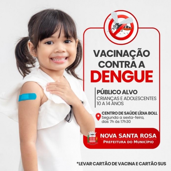 A Secretaria de Saúde da Prefeitura de Nova Santa Rosa, informa que as crianças e adolescentes de 10 a 14 anos de idade foram contemplados com a vacina da dengue.