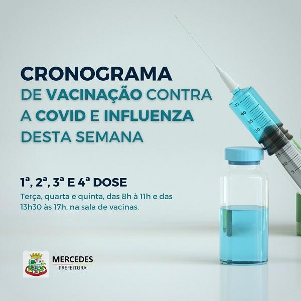 A Secretaria de Saúde de Mercedes divulgou o cronograma de imunização contra a covid-19 desta semana. Serão aplicadas 1ª, 2ª, 3ª e 4ª dose e influenza (gripe).