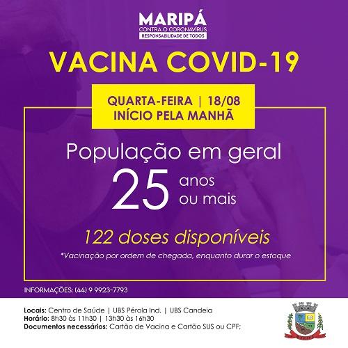 Com a chegada de novas remessas de vacinas contra a covid-19, o Município de Maripá irá retomar a vacinação para pessoas com 25 anos ou mais nesta quarta-feira (18). Os lotes somam 122 doses de imunizantes da Pfizer e Coronavac.
