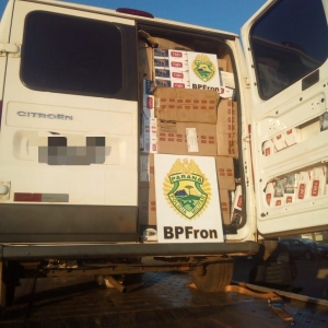 Ao realizar revista, foi constatado que o veículo estava completamente carregado com cerca de 140 caixas de cigarros contrabandeados do Paraguai.