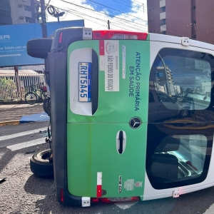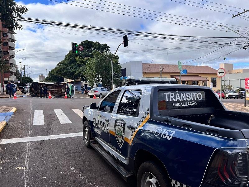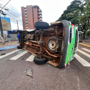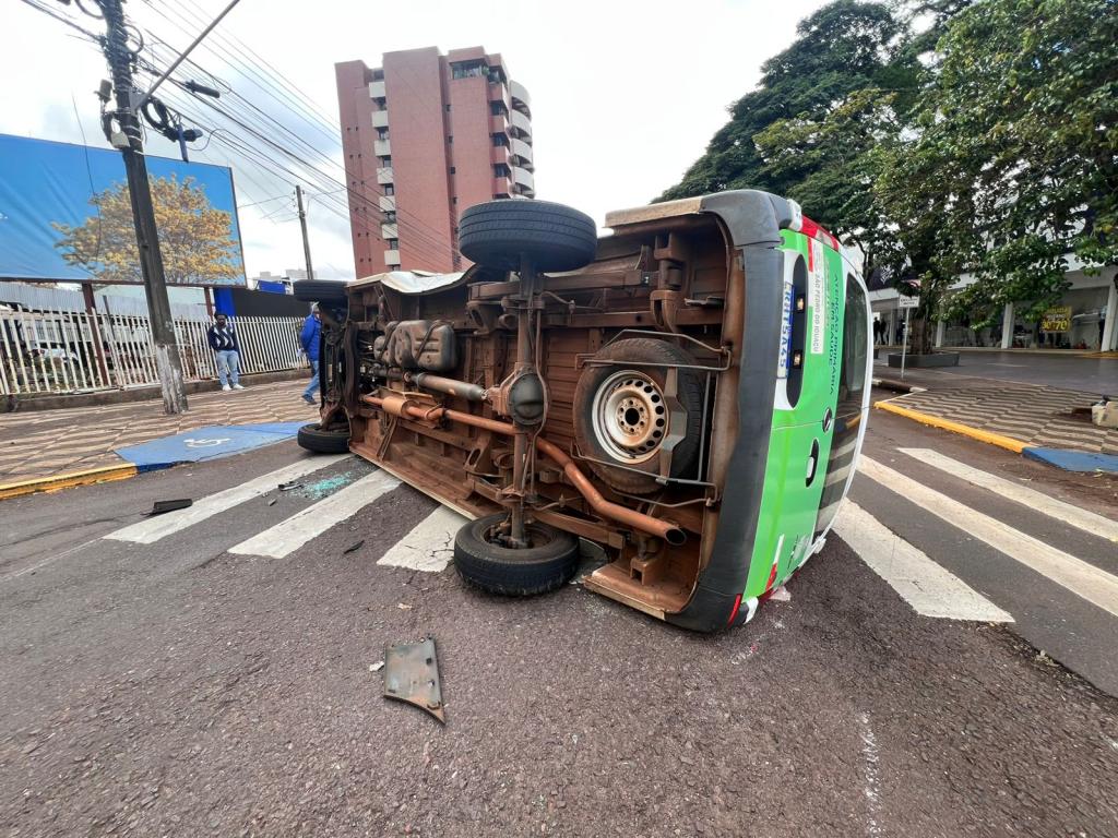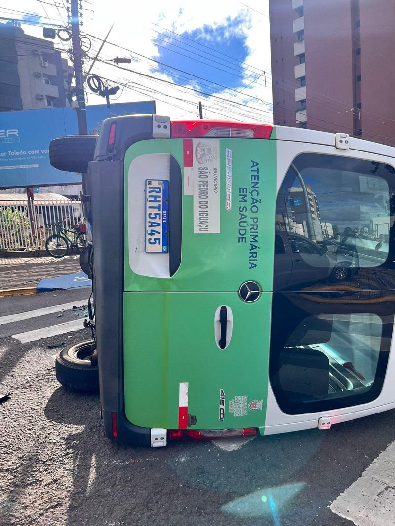 ma colisão entre dois veículos no centro de Toledo provocou o tombamento de uma van da Prefeitura de São Pedro do Iguaçu na tarde desta segunda-feira (28). O acidente ocorreu no cruzamento das ruas Sarandi e Guarani, onde há semáforo.