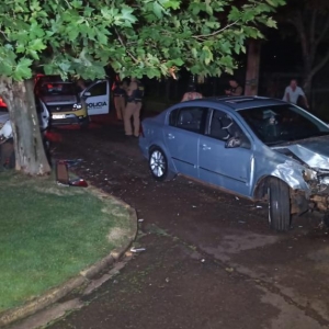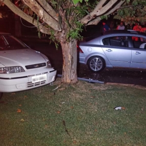 A colisão foi na traseira do Palio, que foi jogado contra uma árvore.