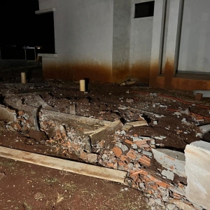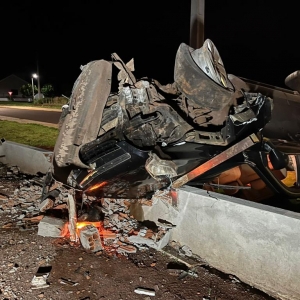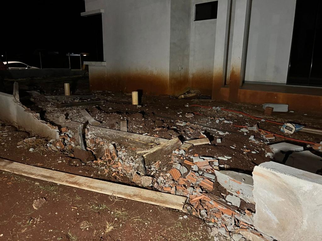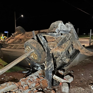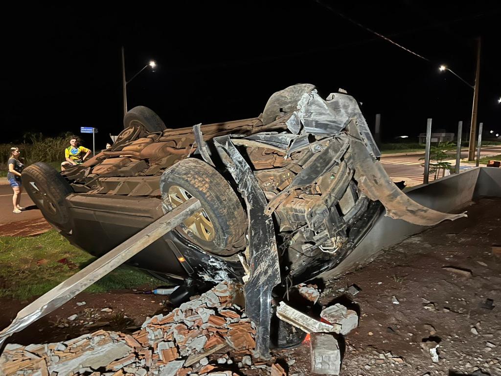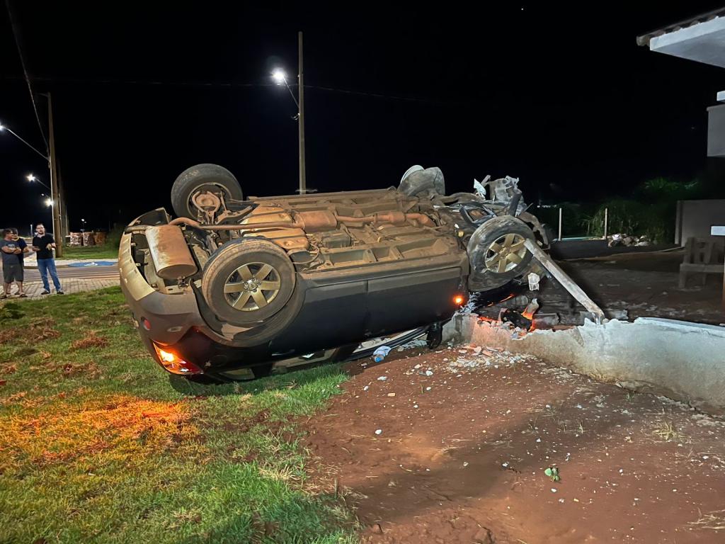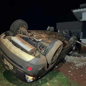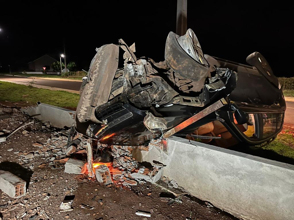 O veículo saiu da pista e capotou por algumas vezes, destruiu o muro de uma residência em construção e parou com as rodas para cima.