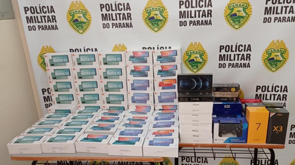 Durante buscas no interior do veículo, foi localizado no porta malas, duas malas de viagem cheias de aparelhos eletrônicos sendo a maioria aparelhos celulares, avaliados em aproximadamente 45 mil reais.