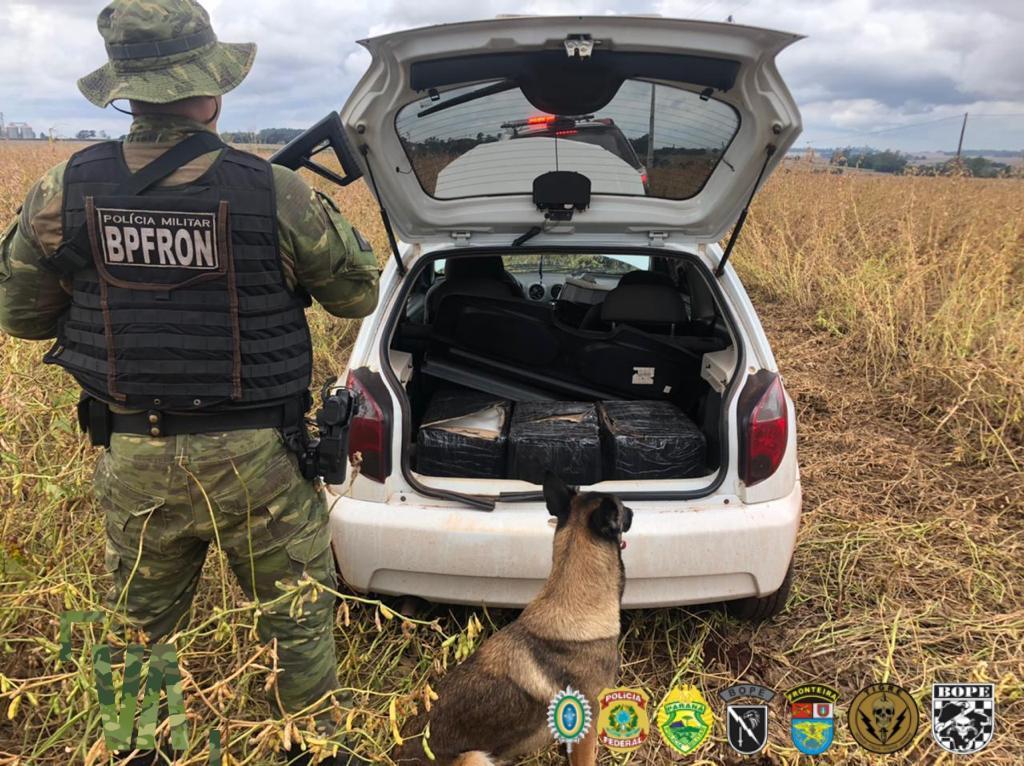 Na tarde de sexta-feira, policiais militares do Pelotão de Operações com Cães do BPFRON - Batalhão de Polícia de Fronteira em ação integrada com policiais federais realizavam patrulhamento na área rural em Terra Roxa, durante Operação Hórus, quando avistaram um veículo GM/Celta.