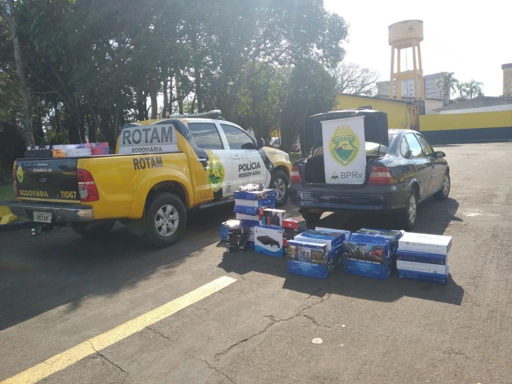 Após a verificação da documentação, foi constatado que o veículo estava com o porta malas carregado com eletrônicos (baterias de celulares, celulares , GPS perfumes, vídeo games) sem a devida documentação de importação.