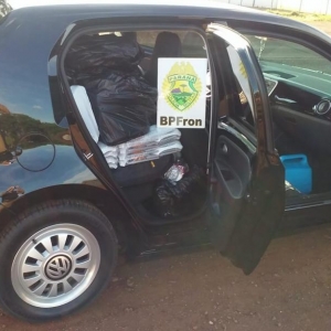 Em dado momento um veículo VW/Up de cor preto foi abordado. Foi realizado revista veicular onde foi constatado que o veículo estava carregado com produtos oriundos do Paraguai sem o devido desembaraço aduaneiro.