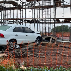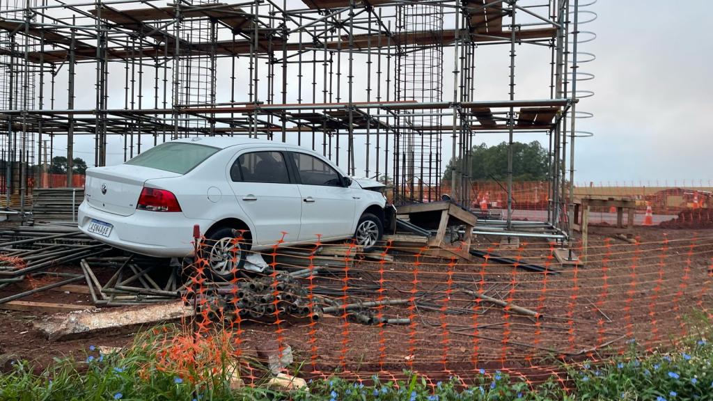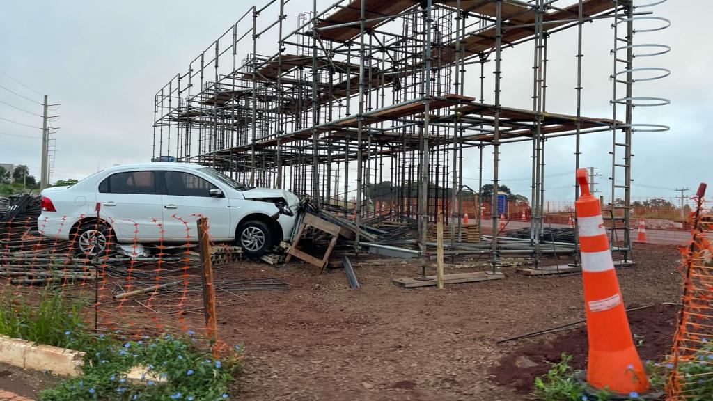 Sem conseguir parar a tempo, o carro subiu o canteiro central e colidiu contra uma estrutura de concreto que está sendo utilizada nas obras do futuro viaduto no local.