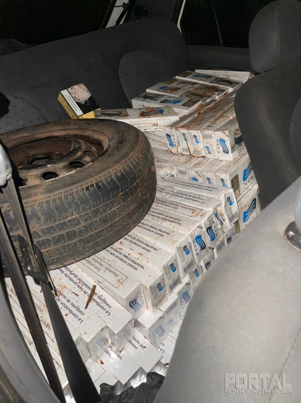 Ao se aproximar do veículo foi constatado que em seu interior continha vários pacotes de cigarro (meia carga) de origem estrangeira de marcas Fox e Hudson (aproximadamente 10 caixas). O veículo foi recolhido ao pátio do Terceiro Pelotão de Polícia Militar de Palotina para posteriormente ser encaminhado à Receita Federal.