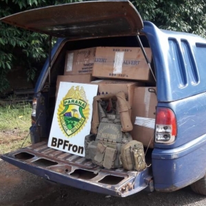 No local foi encontrado e apreendido um veículo VW Saveiro carregado com várias caixas de cigarros de origem paraguaia.