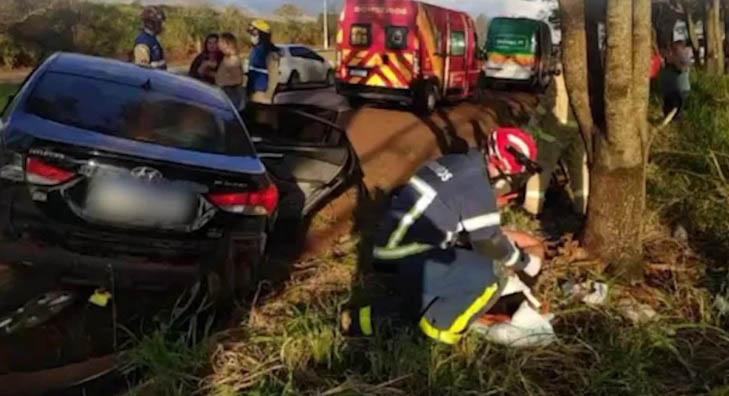 A motorista do carro Elantra com placas do município de Palotina perdeu o controle da direção e bateu contra uma árvore.
