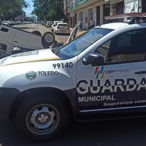 Um capotamento aconteceu no início da tarde desta terça-feira no cruzamento da rua Piratini com rua Santos Dumont no centro de Toledo e envolveu um veículo BMW um utilitário Volkswagen Saveiro, os dois com placas Mercosul.