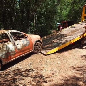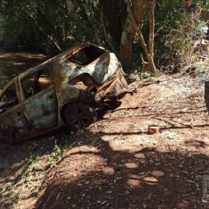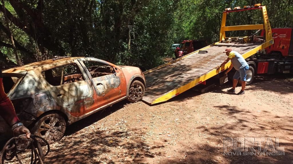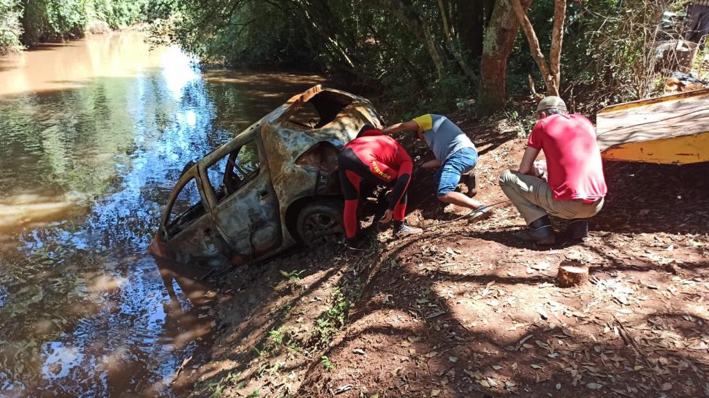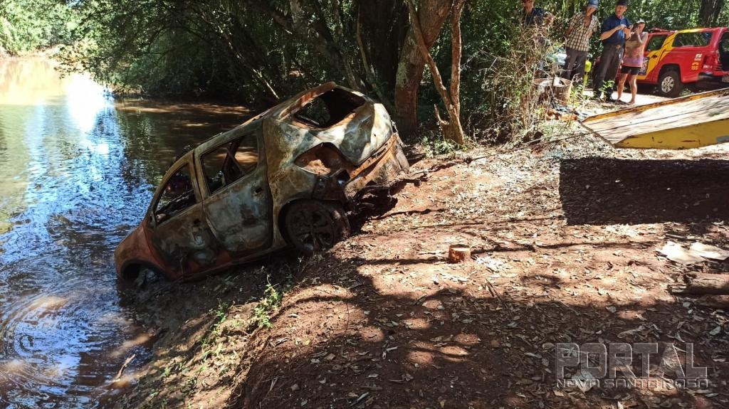 O encontrado se deu quando uma pessoa passava pelo local ontem e percebeu que dentro da água submerso estaria um veículo, após ser localizado foi acionado um guincho para retirar de dentro do rio, mas antes de o veículo ser jogado para dentro do rio o mesmo foi queimado.