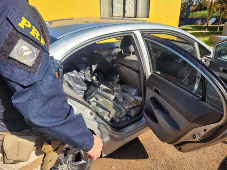 Durante a vistoria, foram encontrados 233 quilos de maconha, que estavam espalhados pelos bancos traseiro e dianteiro do passageiro.