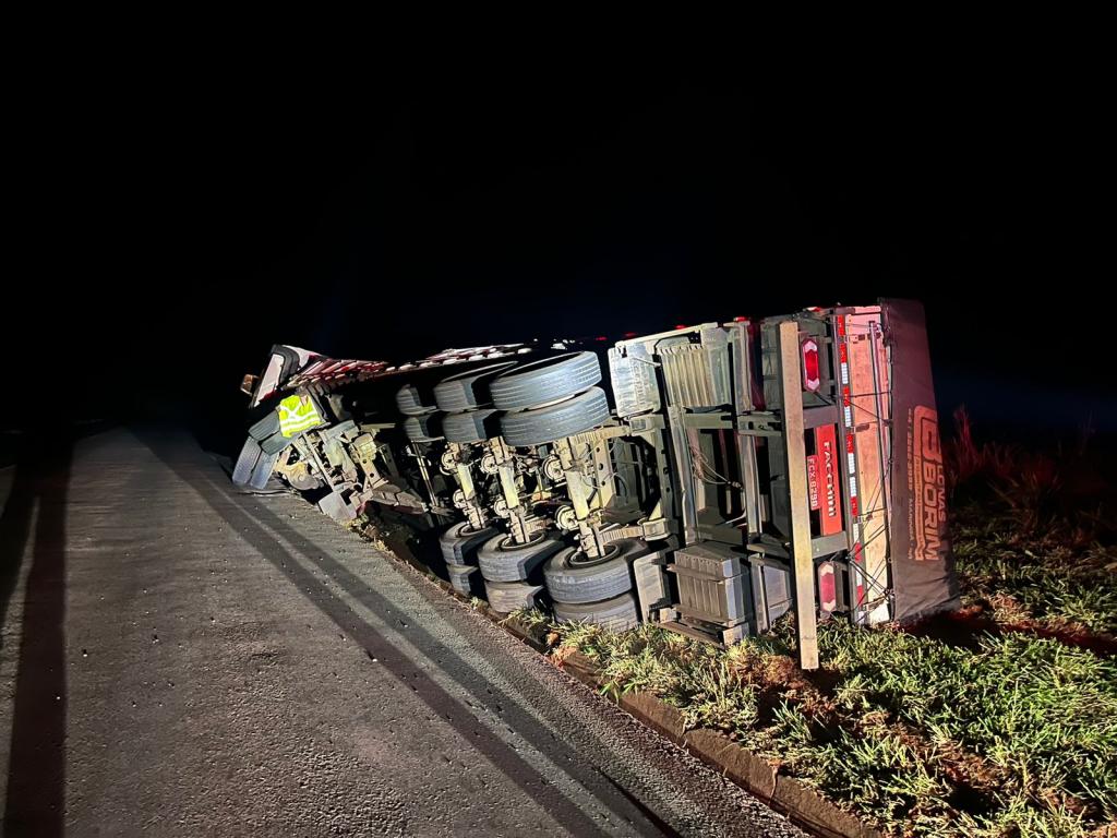 No final da tarde de quinta-feira (16), um acidente de trânsito foi registrado na PR-486 em Alto Piquiri, onde um veículo de carga, modelo Scania, acabou tombando.