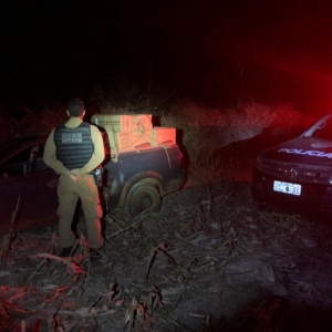 Na tentativa de abordagem dois dos veículos conseguiu empreender fuga, no entanto uma Montana de cor cinza tentou fuga através de uma plantação de milho recém colhida e caiu em um buraco vindo a quebrar o eixo dianteiro, o que impossibilitou a fuga.