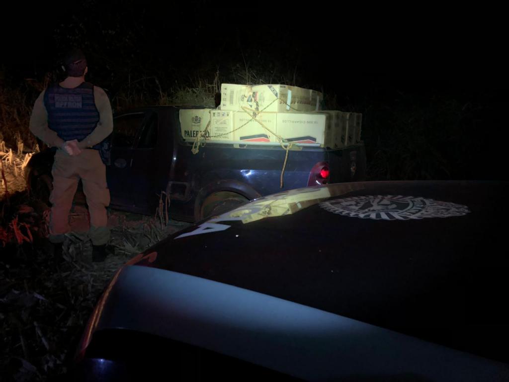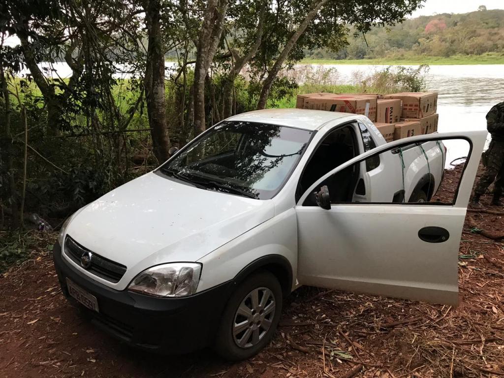 No local foram apreendidos uma embarcação de alumínio com motor Mercury 40hp e 01 pick-up Montana carregados com aproximadamente 30 caixas de cigarros contrabandeados do Paraguai, um prejuízo de aproximadamente R$95 mil à quadrilha criminosa.