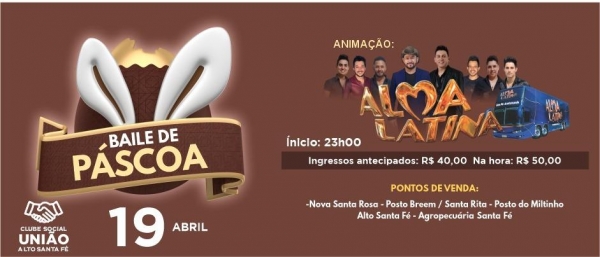 O tradicional Baile de Páscoa, no Clube Social União em Alto Santa Fé, será no dia 19 de abril. O evento tem início às 23h e promete animar o público com a banda Alma Latina, conhecida por seu excelente repertório.