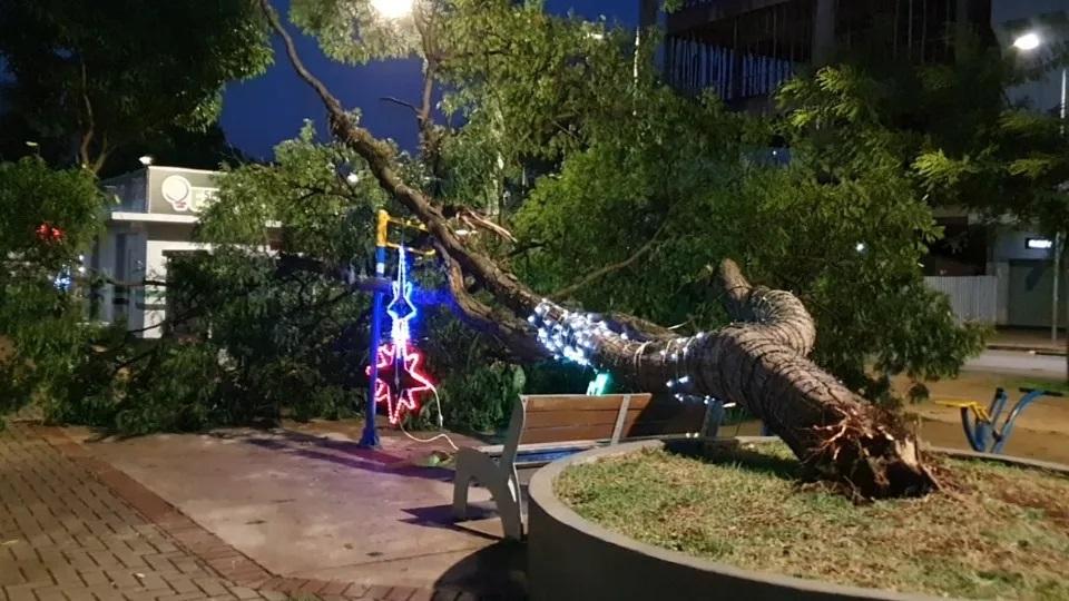 Ainda na Avenida Brasil, próximo à Rua 7 de Setembro, uma árvore caiu no canteiro central, atingindo equipamentos da academia ao ar livre que há no local. A árvore ainda está com a decoração natalina e a fiação pode provocar curto-circuitos.