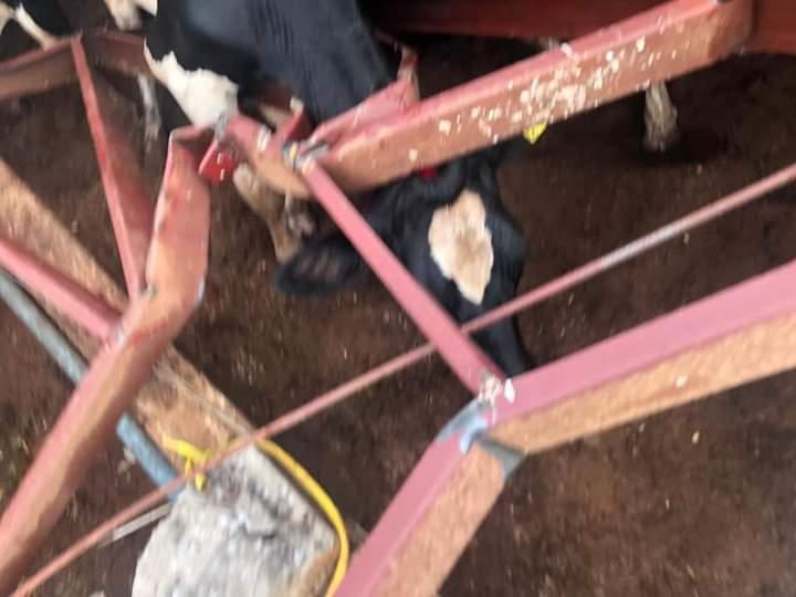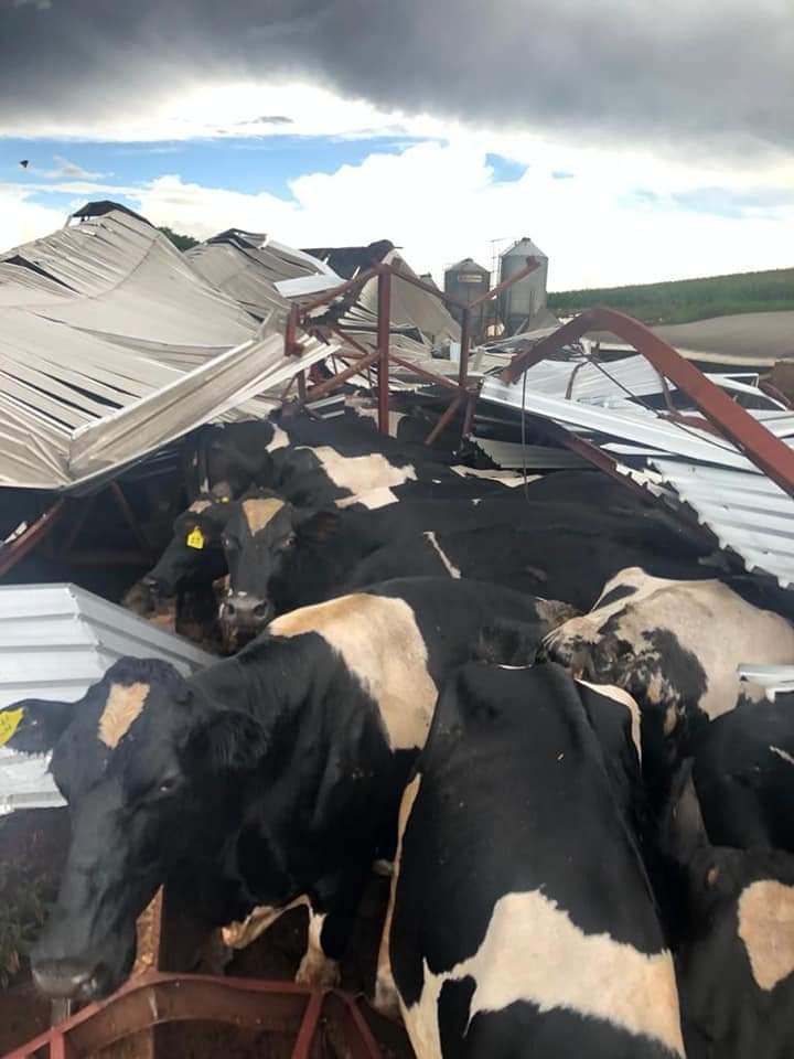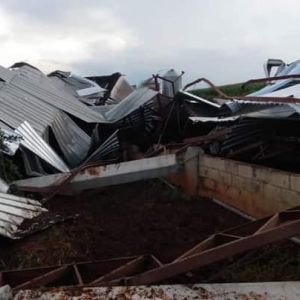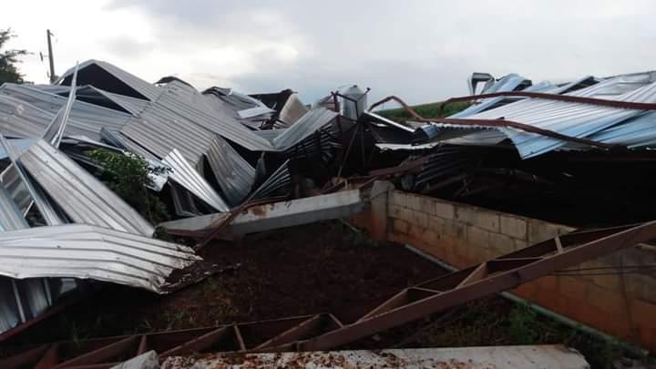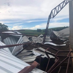 Na comunidade de Pinhalzinho, a cobertura e a estrutura de um barracão que abrigava vacas leiteiras não suportou a força do vento e acabou caindo.