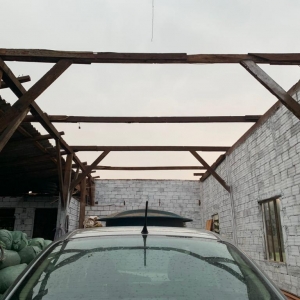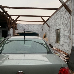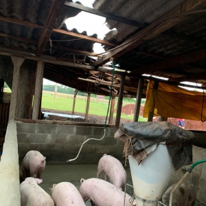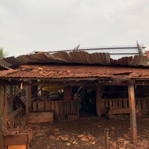 Por sorte o veículo que estava no barracão não foi afetado, parte do telhado do chiqueiro também foi destruído.