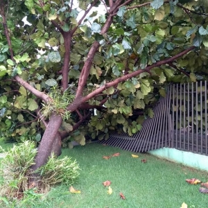 Com o peso da árvore a cerca cedeu e o portão eletrônico foi danificado.